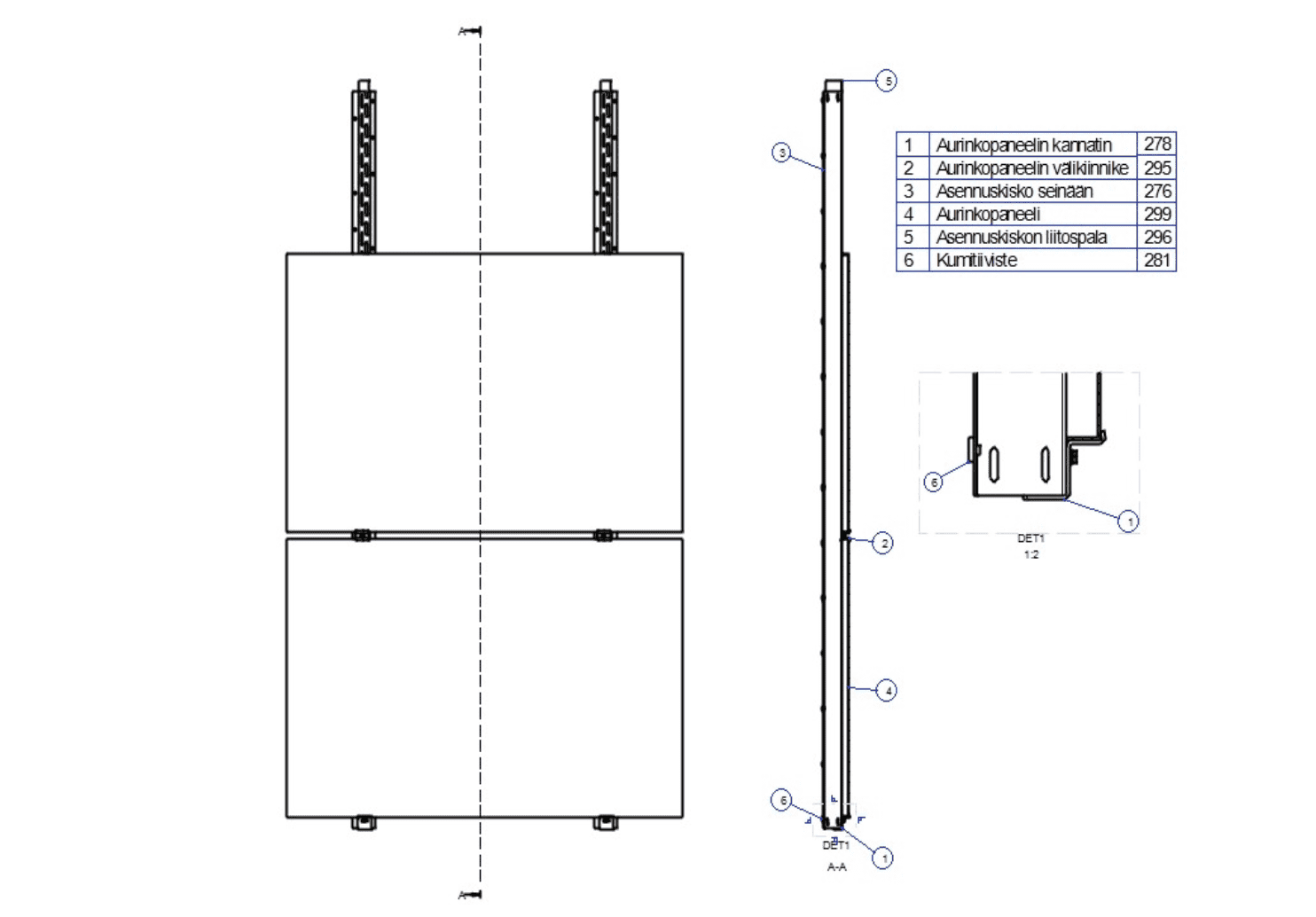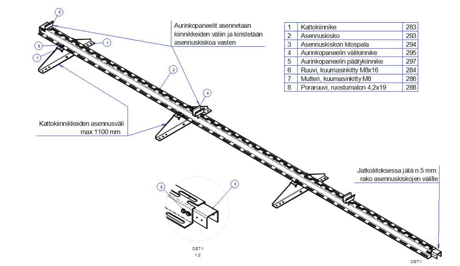 Tarkista, että kaikki paneelit ovat suorassa ja kiinnikkeet ovat kunnolla kiristetty. Varmista, että kaikki päätykiinnikkeet ovat tiukasti kiinni ja pitävät paneelit turvallisesti paikoillaan.