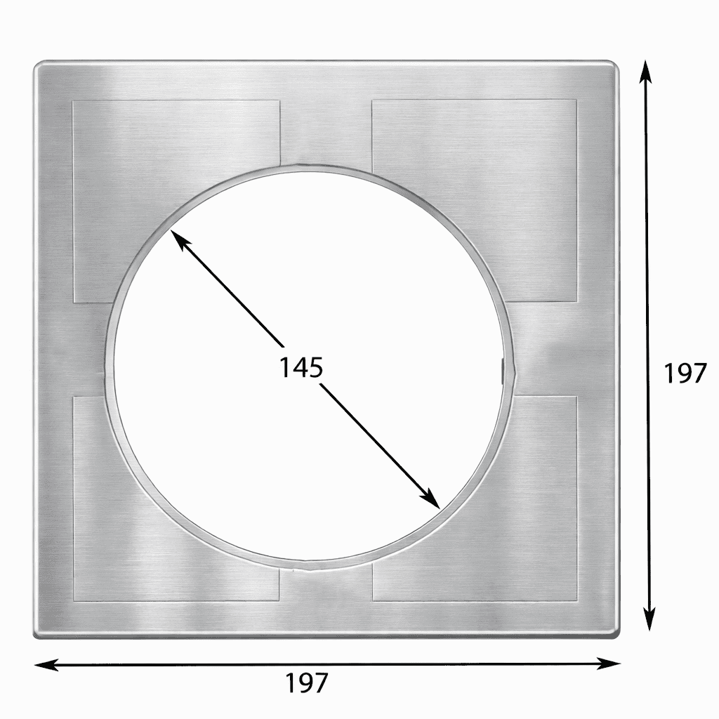 Tuotteen kehyksen koko 197x197mm ja kannen koko 187x187mm.