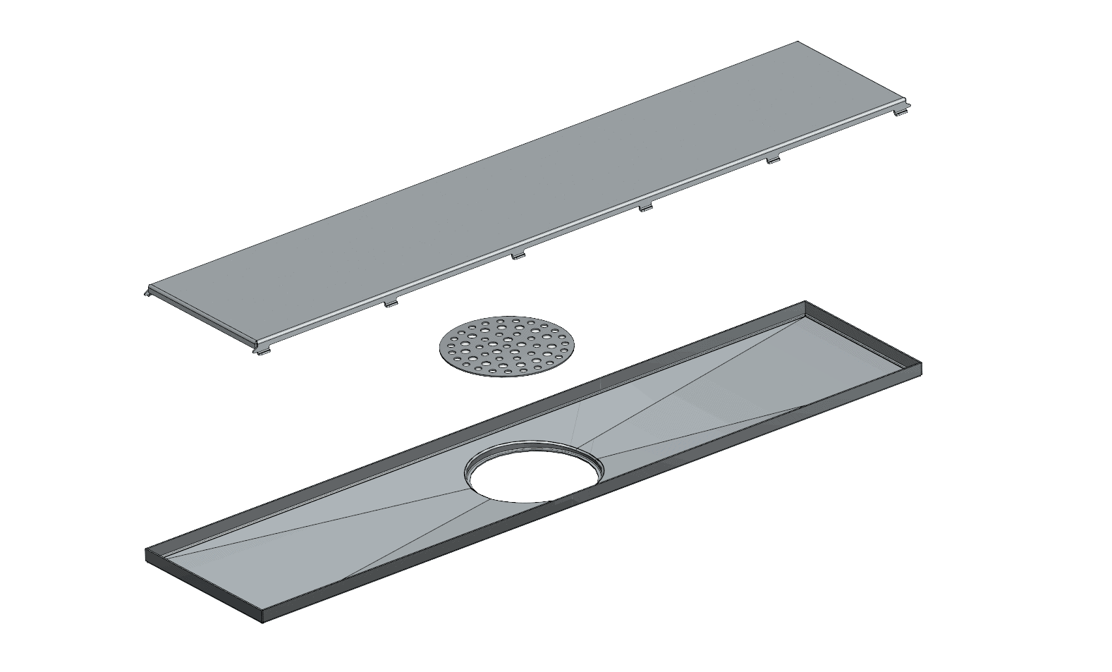 PP-Tuotteen pitkä lattiakaivonkansi on moderni katseenvangitsija kylpyhuoneessa. Tuote sisältää ruostumattomasta teräksestä valmistetun asennuskehyksen lisäksi kannen molemmat mustaksi polttomaalattuna. Soveltuu yleisesti käytetyille kaivoille, ulostulo noin 150 mm