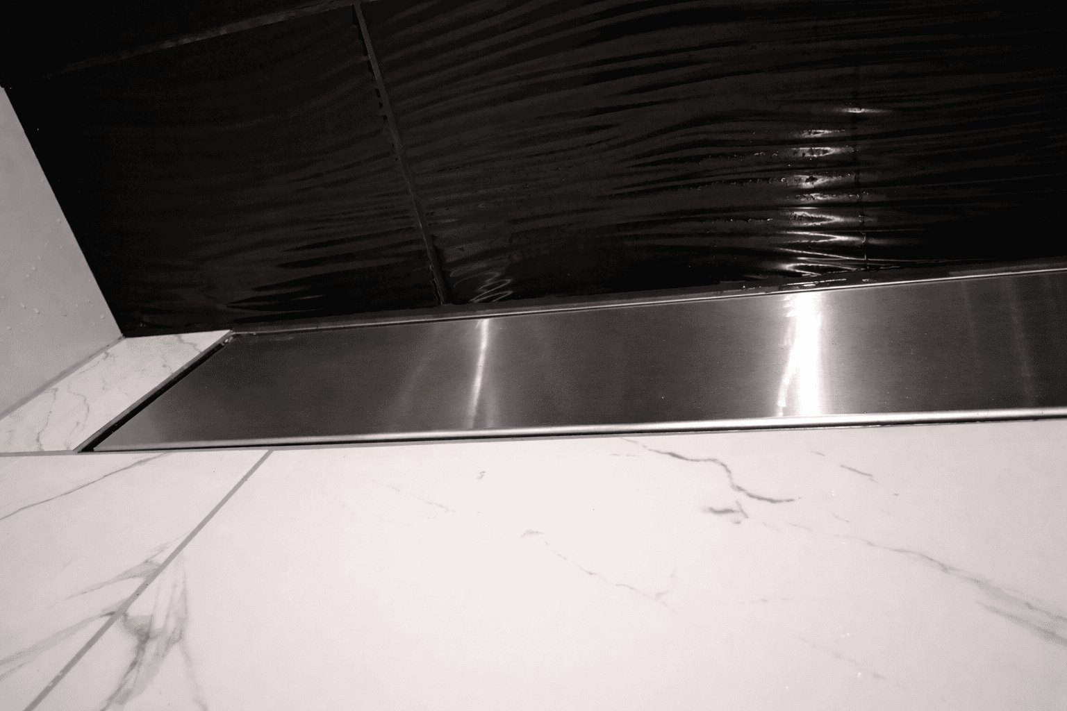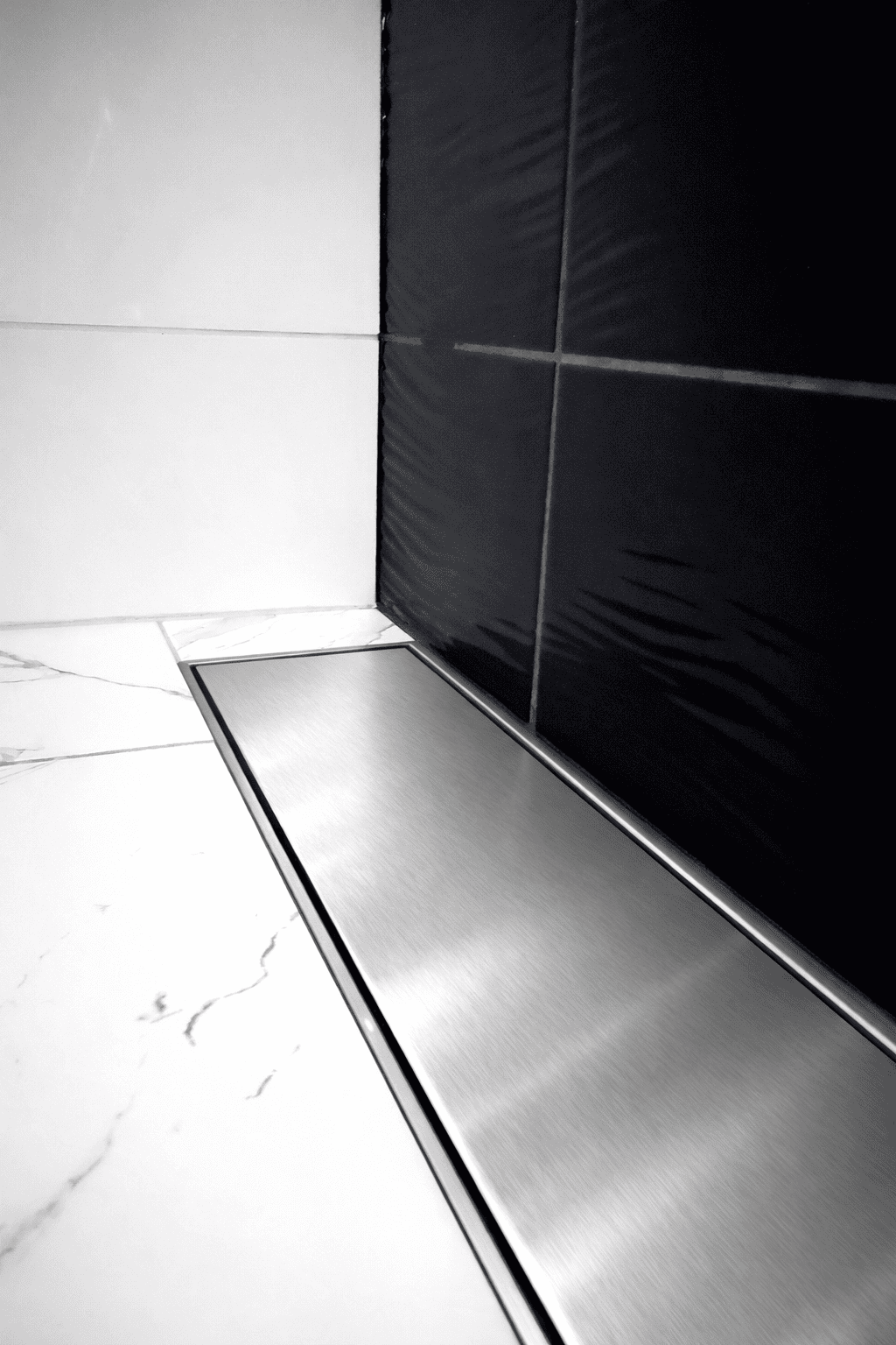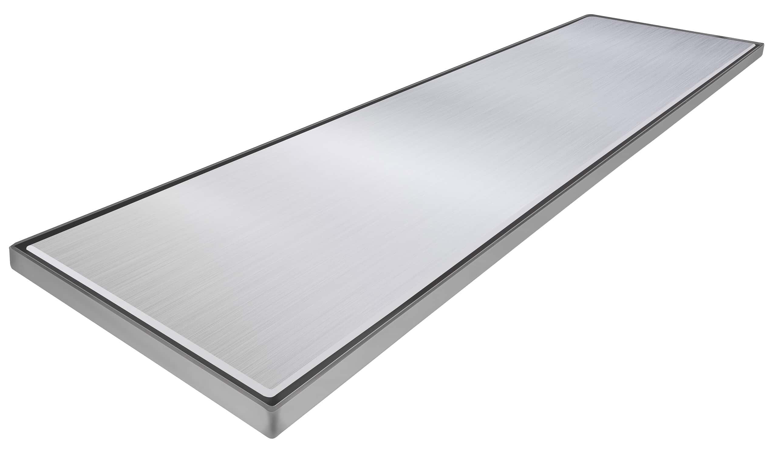 PP-Tuotteen pitkä lattiakaivonkansi on moderni katseenvangitsija kylpyhuoneessa. Tuote sisältää ruostumattomasta teräksestä valmistetun asennuskehyksen lisäksi kannen joko käsittelemättömänä tai mustaksi polttomaalattuna. Soveltuu yleisesti käytetyille kaivoille, ulostulo noin 150 mm