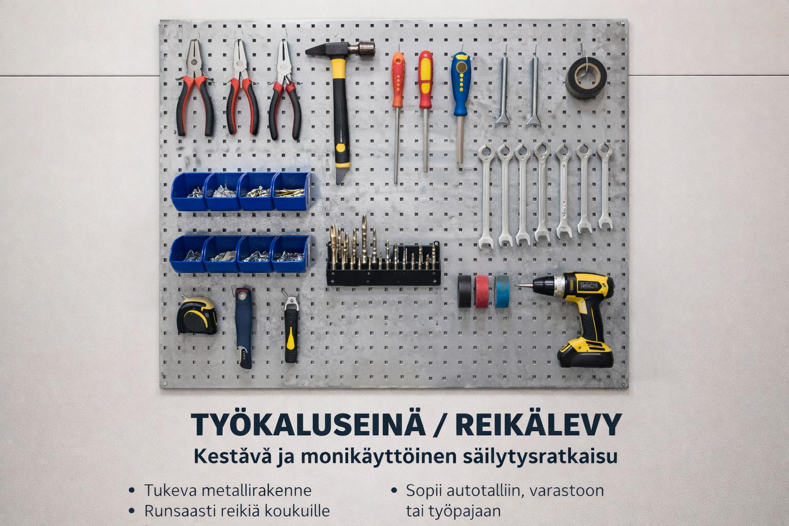 työkaluseinä, teline työkaluille, työkalujen säilytys, kestävä työkaluseinä